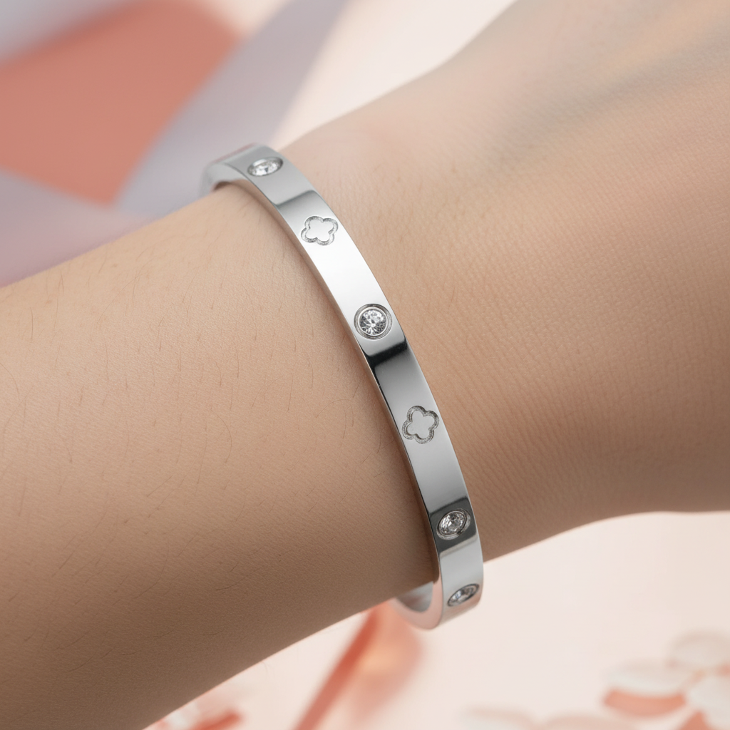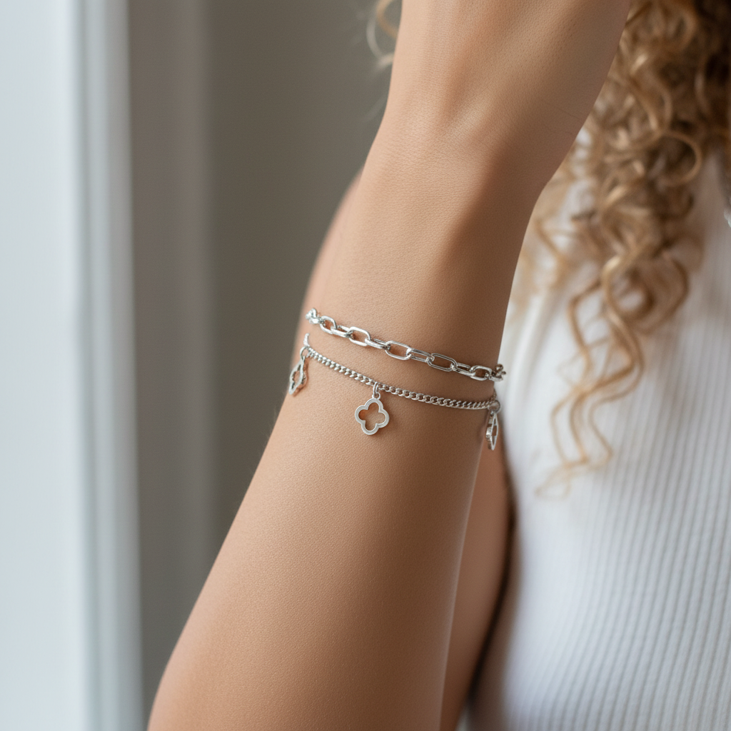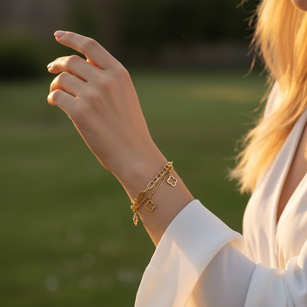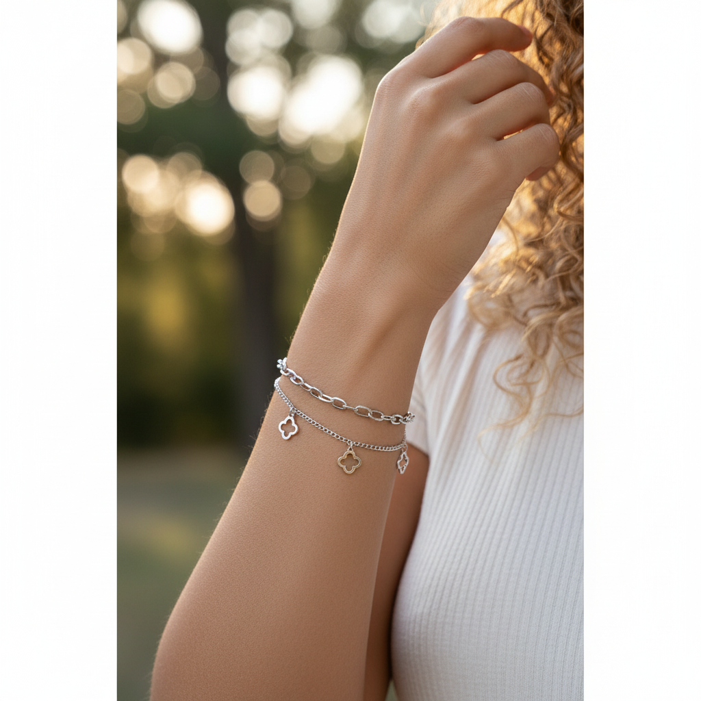 Carry a little luck wherever you go. This stunning double-layer clover charm bracelet features a bold paperclip chain paired with a delicate curb chain, adorned with beautiful open four-leaf clover charms — a timeless symbol of luck, love, and prosperity.