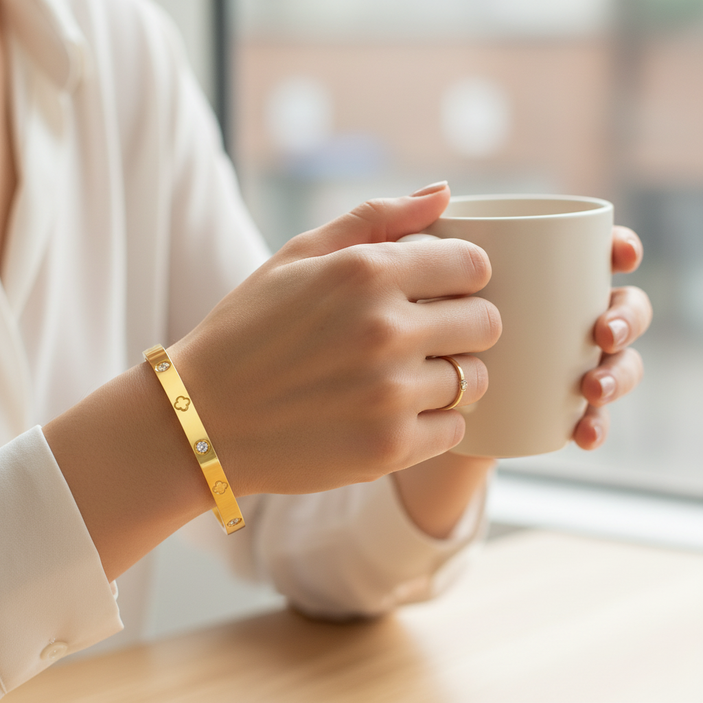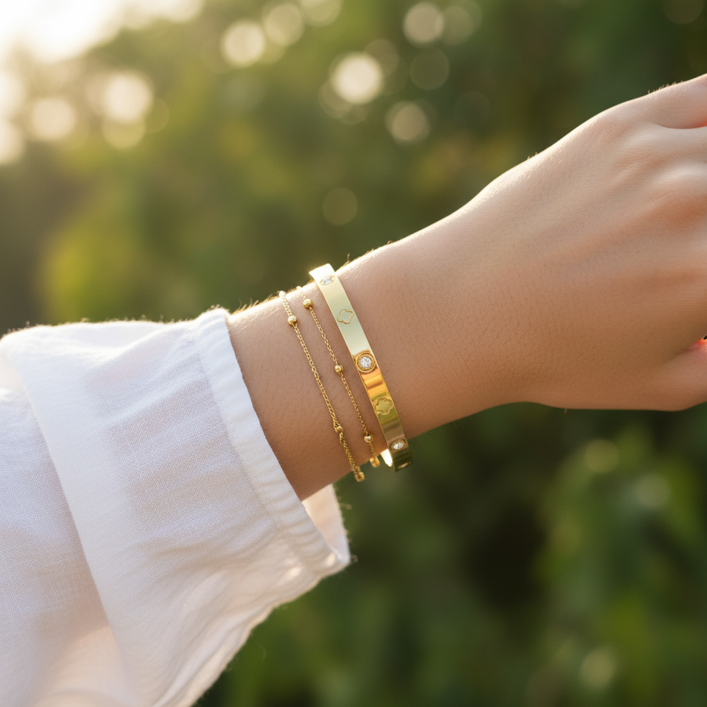 Crafted from 316L surgical-grade stainless steel with 18K PVD gold coating, this bracelet is designed to maintain its radiant shine through every adventure without ever fading, tarnishing, or turning your skin green. Perfect for stacking or wearing solo.